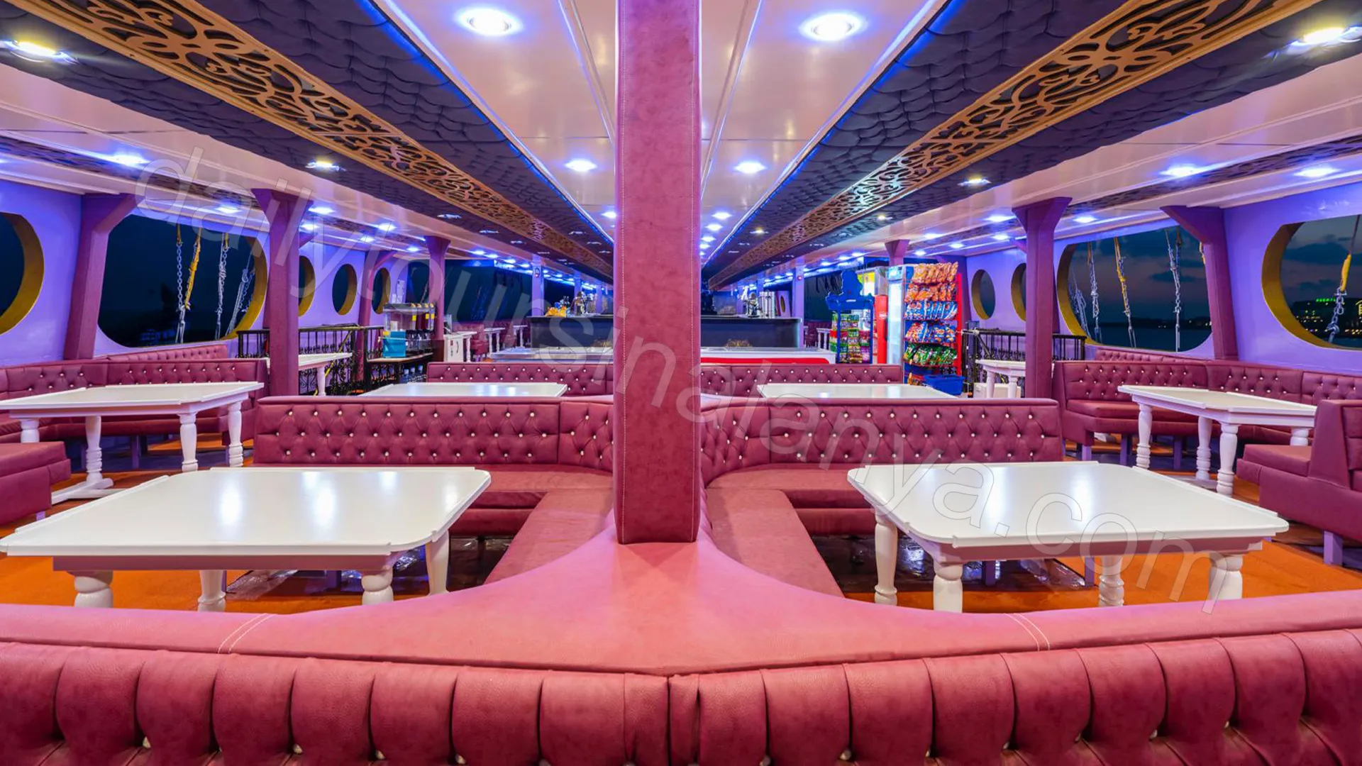 Once the last light fades, the Last King takes on a completely new identity. LED strips, coloured spotlights and a themed lighting system switch on across every deck, turning the vessel into a floating island of light in the middle of the sea. This visual transformation is the signal that the night programme is about to begin. The illuminated atmosphere — something you will never see on a daytime cruise — is what places the Last King Sunset Boat Trip Alanya experience in a category of its own.