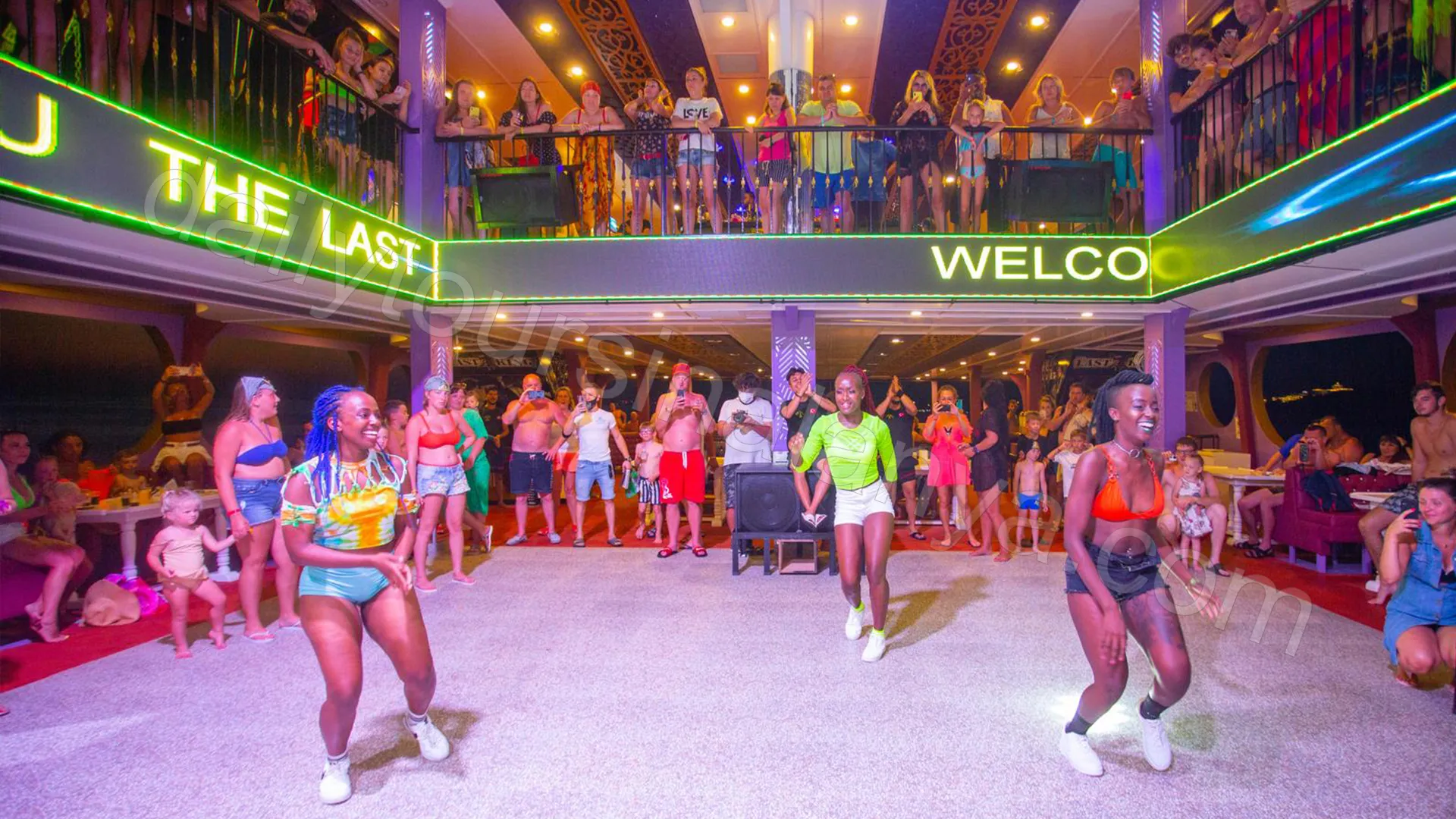 Golden horizons, a glowing deck, disco beats and a fire show over the sea — the best hours of the night happen on this ship.