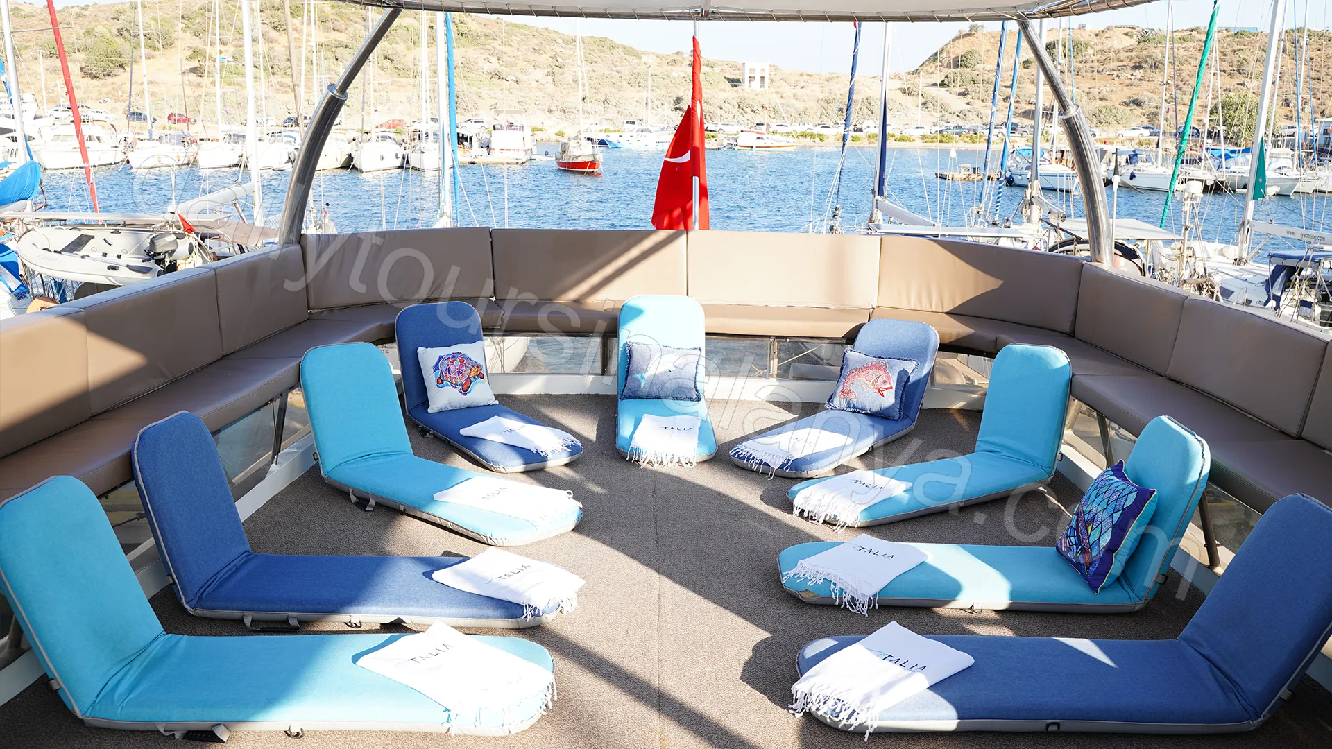 On the upper sun deck, turquoise and blue lounging cushions are laid out with branded "TALIA" peshtemal towels at each spot. Decorative cushions and a wraparound leather U-sofa along the stern add further seating. Together, these details lift the Talia VIP yacht cruise Alanya experience well above a standard boat excursion and into genuine hospitality territory.