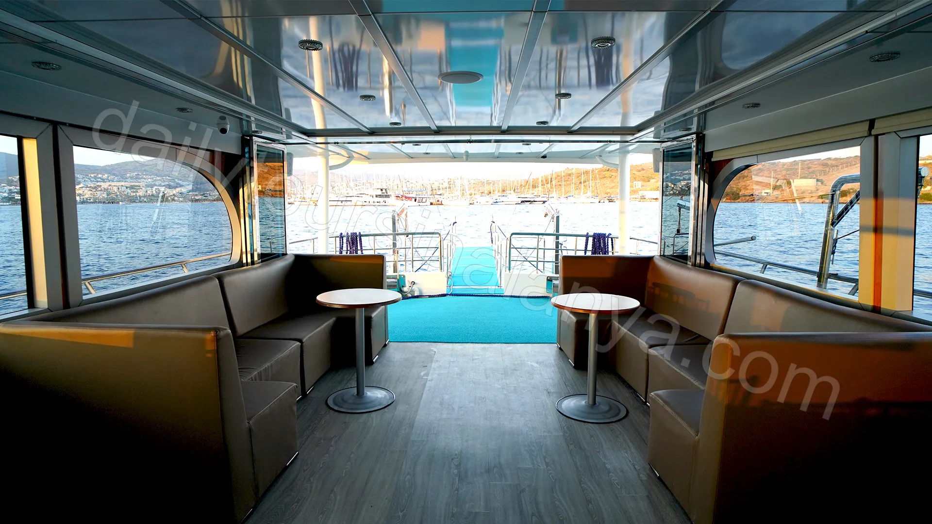The twin-deck layout places a glass-panelled restaurant salon on the lower level and an open sun deck above. The lower salon is fully air-conditioned, providing a cool dining environment regardless of outside temperatures. Up top, wide seating areas, individual sun loungers and a shaded lounge corner offer unobstructed sea views from every angle.