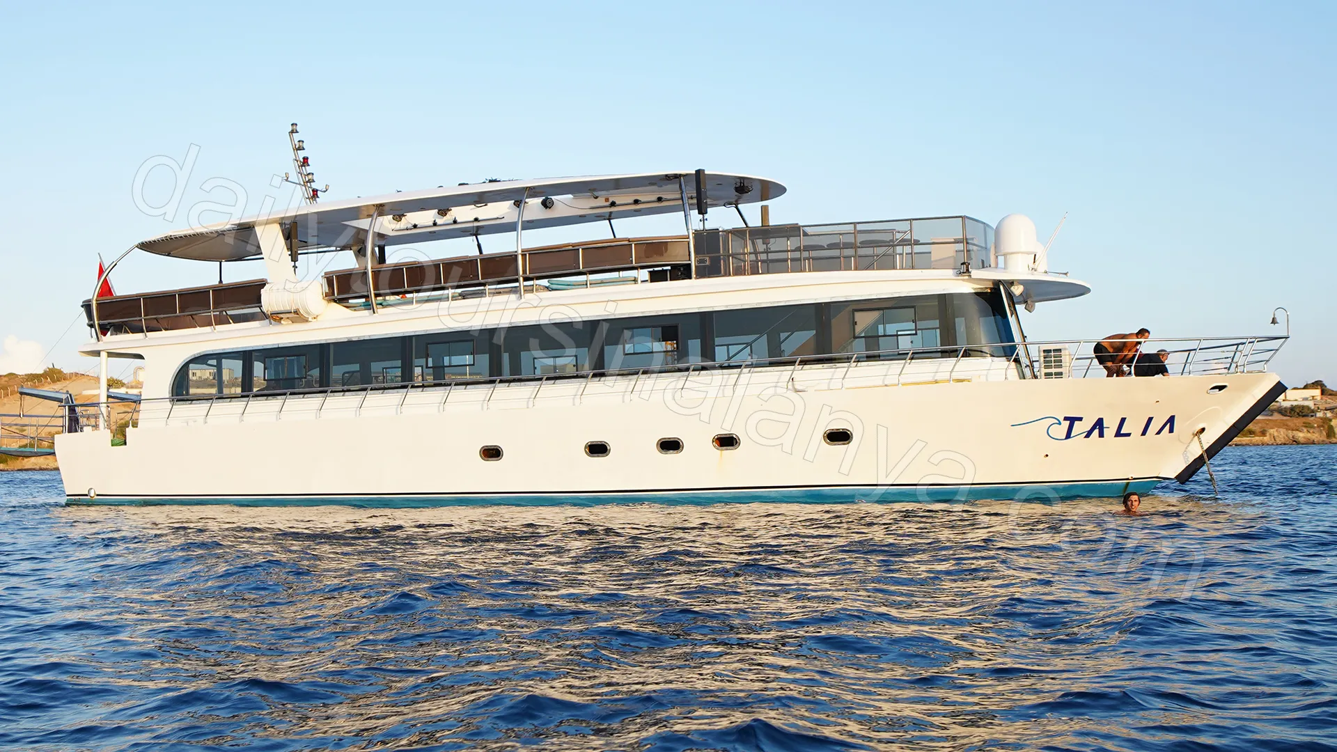 Dozens of excursion boats leave Alanya Harbour every day, but the vast majority are traditional wooden gulets or pirate-themed party ships. Talia occupies an entirely different category: a fibreglass-hulled, modern-design motor yacht running scheduled day cruises. No other vessel of this size and specification offers public day trips from Alanya.