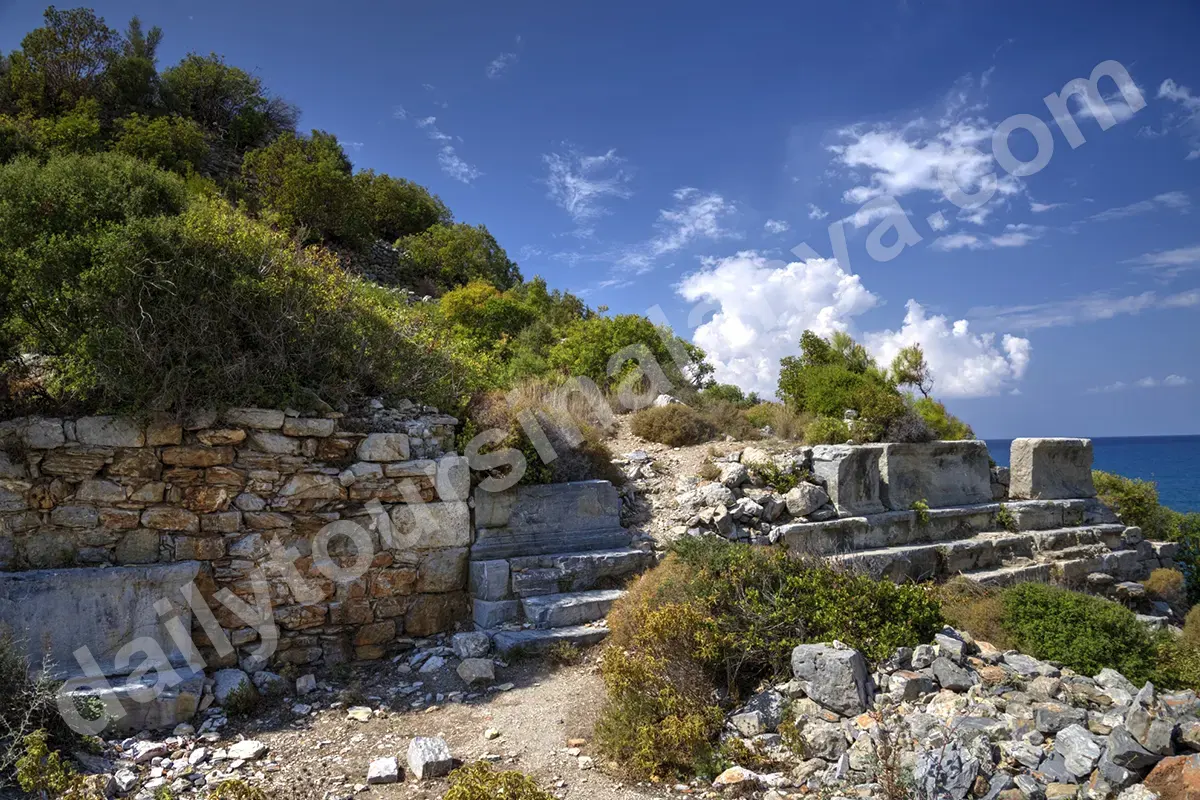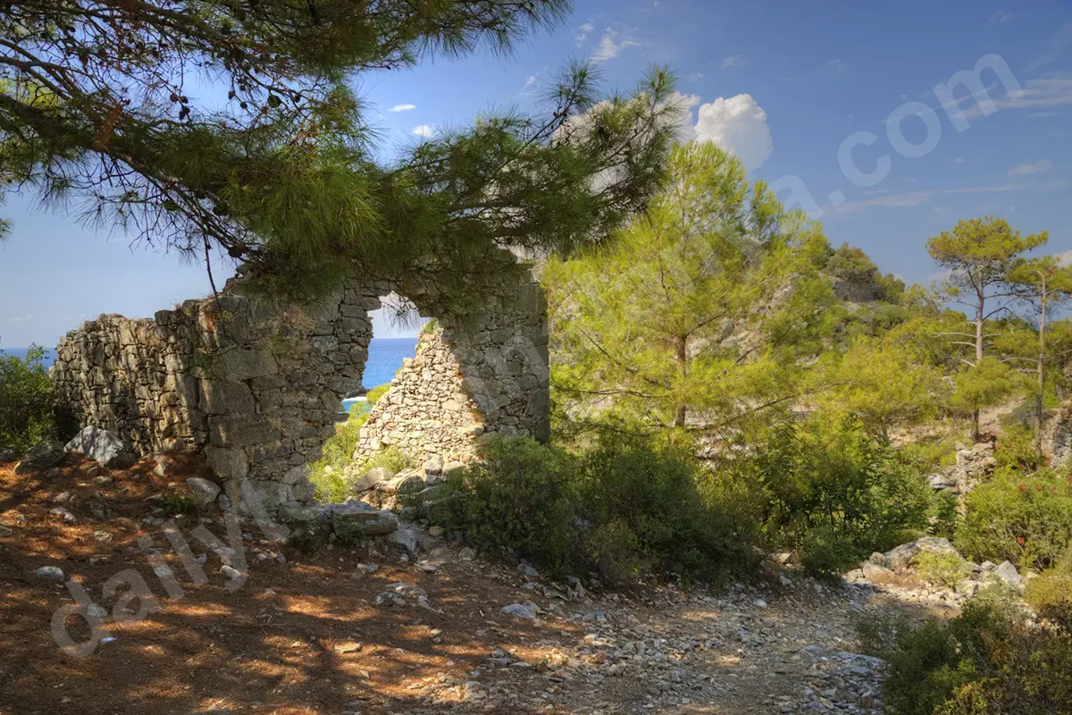 Koydaki patika yoldan yürüyerek antik kente ulaşabilirsiniz. Bu kısa yürüyüş, çevredeki doğal manzaraların keyfini çıkarmanızı sağlarken, aynı zamanda antik kentin tarihi atmosferine adım adım yaklaşmanızı sağlar.
